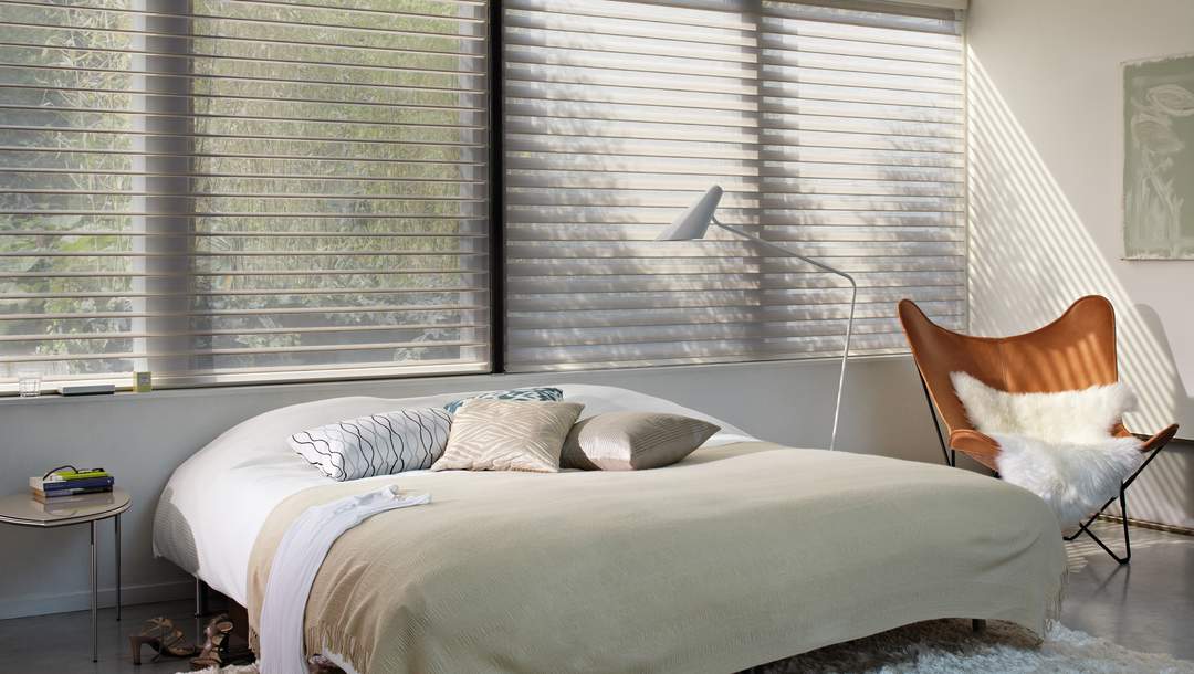 Med sine myke svevende lameller filtrerer Silhouette® gardinen det skarpe sollyset og sprer et mykt og behagelig lys. Vinkle de myke lamellene til ønsket lysinnslipp, samtidig som gardinen filtrerer bort det skarpeste sollyset og UV-strålene. Silhouette® gardiner finnes i to lamellbredder: 50 og 75 mm, for vakkert å balansere alt fra små til store vinduer og glasspartier med en myk tekstilfølelse.